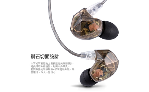 鑽石切割外觀設計 採用鈹合金振膜,一體成形氣室鑄造 舒適配戴設計,線材抗拉不纏繞 三頻均衡,適合弦樂、女聲、流行樂