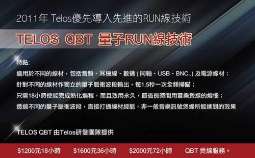 $1200元18小時 ,$1600元36小時,$2000元72小時QBT 煲線服務。 QBT - 深層量子熟化技術 / Quantum Burning Technology 不同於其它廠家,Telos創辦人Jeff Lin 認為在21世紀的當今音響線材的技術 不外乎,強調金屬冶煉!或者導入工業用的超冷處理,並沒有相當巨大的關鍵性突破,進而促使telos為了能夠比同業更早奪得先機!於2008年就投入研發資金,研究如何讓線材除了工業技術以外能夠再提升的方案! 因此造就了TELOS QBT 量子RUN線機的誕生 2011年 Telos優先導入先進的RUN線技術 --- QBT 量子煲練技術。 為我們親愛的客戶手上的 線材發揮前所未有的最佳效能。 TELOS QBT 是由Telos研發團隊,研發設計製造為旗下四個系列產品 black reference. gold reference. platinum reference ,提供價值$1200元18小時 ,$1600元36小時,$2000元72小時QBT 煲線服務。 舊客戶亦可同時擁有,購買telos線材的客戶請帶購買單據及線材到telos門市經銷據點,同樣可以免費享有 QBT 服務。 (請注意只要TELOS的線材,出廠時已經經過36~72小時的 RUN IN了) 我們一直追求的理念是讓每一位TELOS AUDIO DESIGN的客人可享有更優質的售後服務!與調音服務 使用TELOS QBT你會知道線材還能有如此的躍進!! Quantum Burning Technology (QBT)的誕生從此改變了煲線的歷史! 由TELOS研發團隊,所研發的次世代煲線機, 使用嶄新深層量子熟化技術Quantum Burning Technology (QBT), 透過不同的量子脈衝波段, 更有效地打通了線材上所有不同的接合點, 並加以重新更緊密地以單方向排列, 使得不同線材的潛能完完全全地發揮及強化。 特點: 1) 適用於不同的線材, 包括音頻, 耳機線, 數碼(同軸, USB, BNC..)及電源線材; 2) 針對不同的線材作獨立的量子脈衝波段輸出, 每1.5秒一次全頻掃瞄; 3) 只需18小時便能完成熟化過程, 而且效用永久, 節省長時間用音樂煲線的煩惱; 4) 透過不同的量子脈衝波段, 直接打通線材經脈, 非一般音樂訊號煲線所能達到的效果.