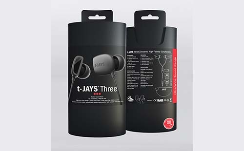 t-JAYS Three外殼覆有黑色橡膠塗層,配備直徑10毫米TCD(覆鈦振膜)釹磁鐵驅動單元,頻率響應範圍為15~25,000Hz,聲壓靈敏度為98dB @ 1kHz。